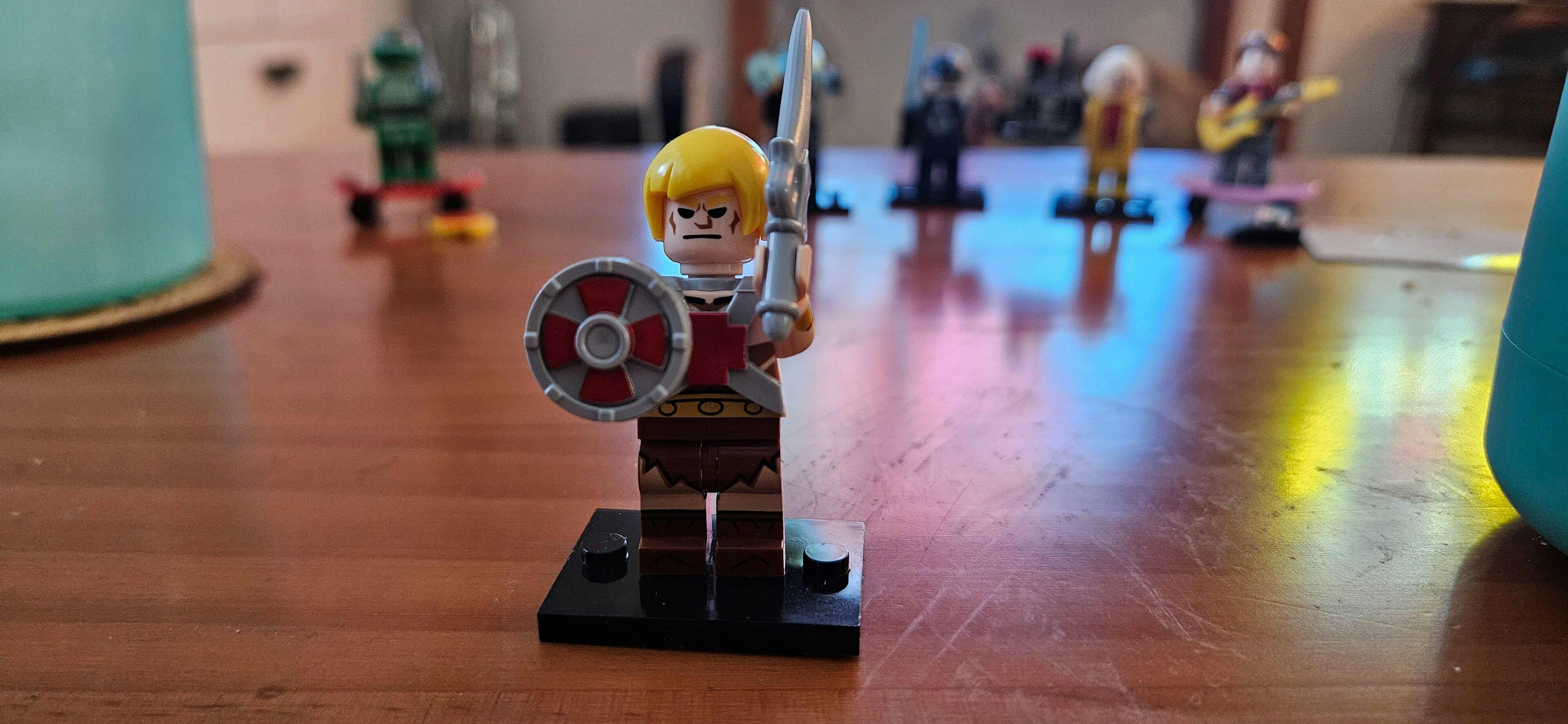 "He-Man Custom LEGO Minifigure with Power Sword, shield, and battle armor"